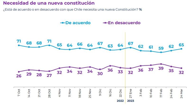 Pese a ello, un 65% está de acuerdo con que Chile necesita una nueva Constitución, lo que representa un alza de tres puntos respecto de la medición anterior.