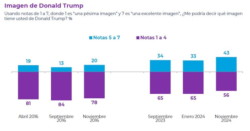 Por otra parte, un 56% de los consultados evalúa negativamente al recién electo presidente de Estados Unidos, Donald Trump. Pese a ello, un 43% tiene una imagen positiva de él, porcentaje que sube 23 puntos más que lo consignado en su primera elección.