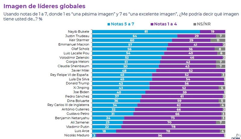 En torno a imagen positiva, al salvadoreño le sigue el primer ministro de Canadá Justin Trudeau (64%), el primer ministro británico Keir Starmer (60%) y el presidente francés Emmanuel Macron (57%), quienes son evaluados con notas de 5 a 7 por los chilenos.
