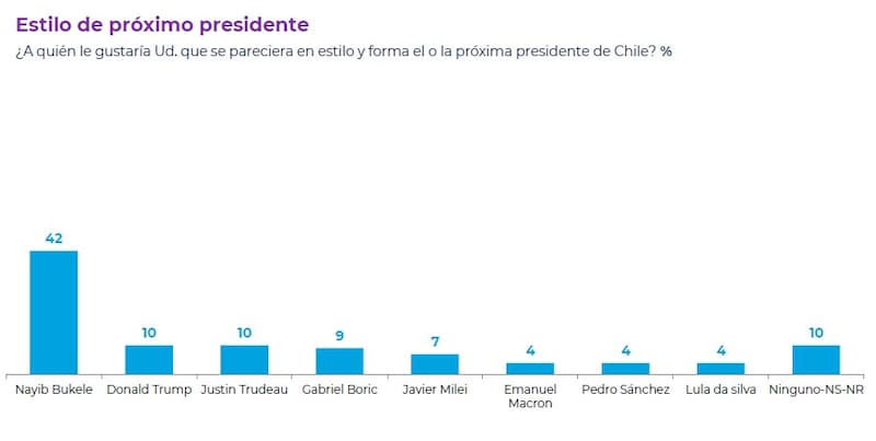 Asimismo, el sondeo de opinión consigna que a un 42% le gustaría que el próximo presidente o presidenta de Chile tuviera un estilo similar al mandatario centroamericano.