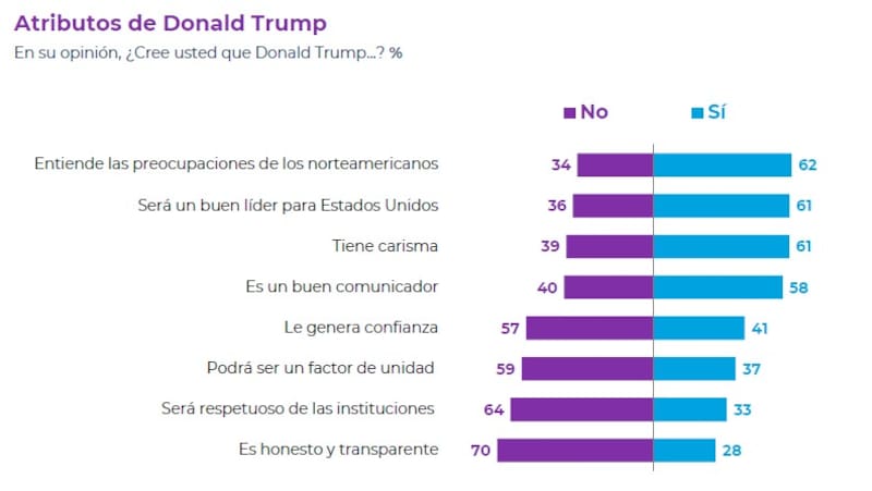 Entre los atributos más destacados del republicano, son que entiende las preocupaciones de los norteamericanos (62%), que será un buen líder para Estados Unidos (61%) y que tiene carisma (61%).