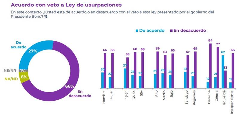 En el sondeo de opinión también se abordó la opinión de los consultados sobre la Ley de Usurpaciones, proyecto que apunta a sancionar las ocupaciones ilegales de inmuebles, como terrenos o viviendas, considerando que el pasado miércoles se inició en la Comisión de Seguridad del Senado la tramitación sobre el veto presentado por el Ejecutivo.