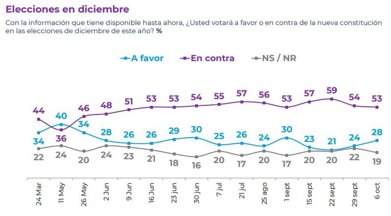 A 53% cayó la intención de votar por la opción Rechazo a la nueva Constitución, en las próximas elecciones que se realizarán el domingo 17 de diciembre, según los resultados arrojados en la encuesta Plaza Pública, que realiza Cadem, correspondientes a la primera semana de octubre.