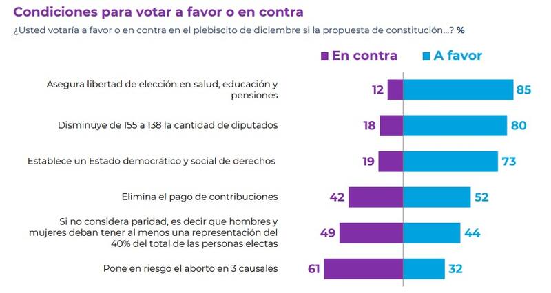 Al respecto, el sondeo dio a conocer que las principales razones que movilizan a votar a favor son que se asegure libertad de elección en salud, educación y pensiones (85%) y disminuir de 155 a 138 la cantidad de diputados/as (80%). En cambio, quienes están por rechazar el texto lo hacen principalmente porque se pone en riesgo la ley de aborto en tres causales (61%) y que no considera la paridad (49%).