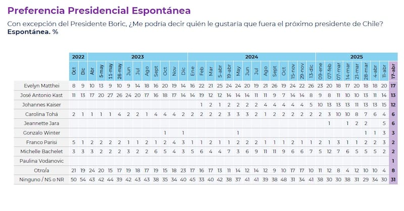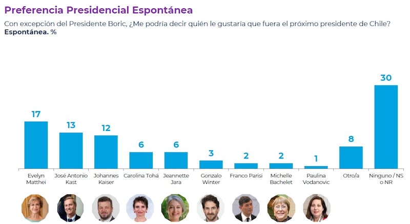 No obstante, las incertidumbres en el sector también repercutieron a los otros aspirantes opositores, ya que tanto el líder republicano José Antonio Kast como el diputado Johannes Kaiser (PNL) consignaron bajas en la preferencia presidencial espontánea. El primero cayó un punto (13%) y el segundo descendió tres puntos (12%) en la última semana.