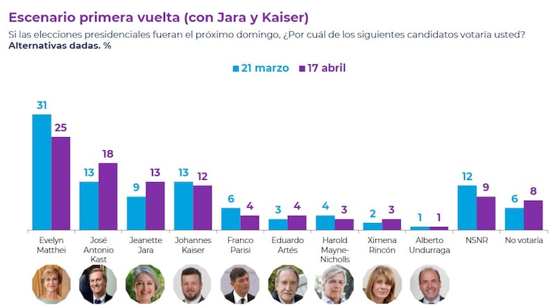 En el caso de que la candidata oficialista fuese Jeannette Jara, Matthei obtendría 25%, Kast a 18%, Jara 13% y Kaiser 12%. Y sin Kaiser, Matthei llegaría a 26%, Kast subiría a 25% y Jara a 12%.