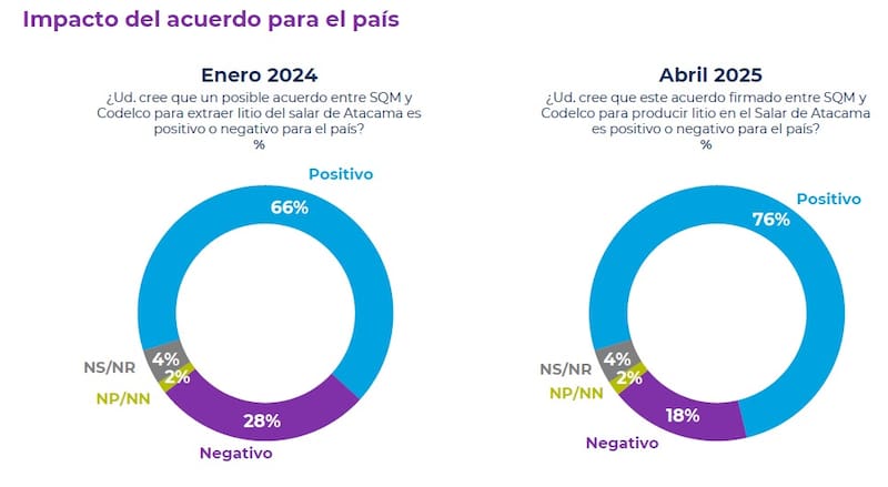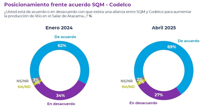 Por otra parte, de un 62% a un 69% subió en los últimos 15 meses el porcentaje de personas que está de acuerdo con que exista una alianza entre SQM y Codelco para aumentar la producción de litio en el Salar de Atacama.