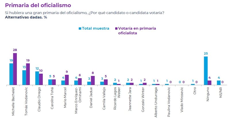 En el oficialismo, en tanto, Bachelet vencería con 28%, seguida por el alcalde Vodanovic (19%) y Orrego (10%).