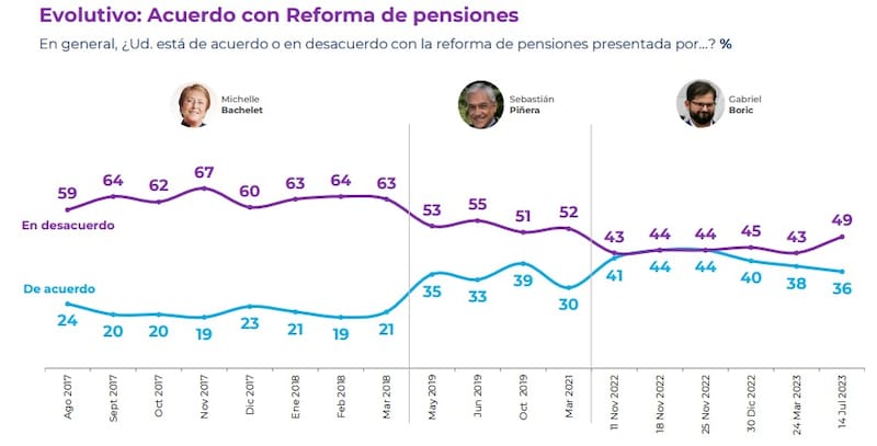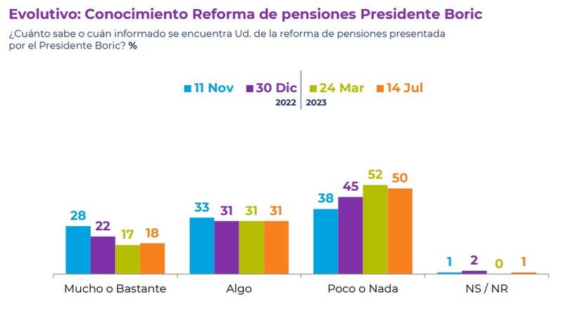 El sondeo además arrojó que un 50% de los consultados está poco o nada informado sobre la reforma de pensiones presentada por el Presidente Boric, mientras que un 70% está de acuerdo con que las AFP no puedan cobrar comisiones cuando su rentabilidad sea negativa y un 64% apoya la creación de una AFP estatal que compita con las privadas.