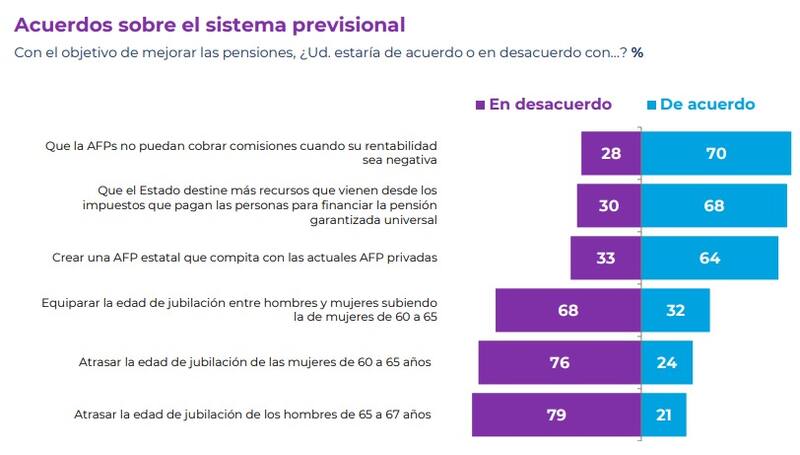 Asimismo, un 70% está de acuerdo con que las AFP no puedan cobrar comisiones cuando su rentabilidad sea negativa; un 68% está a favor con que el Estado destine más recursos que vienen desde los impuestos que pagan las personas para financiar la PGU, y un 64% apoya la creación de una AFP estatal que compita con las actuales AFP privadas.
