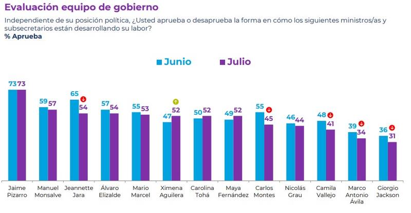 En la segunda semana de julio, la encuesta Plaza Pública, que realiza Cadem, arrojó en sus resultados que los ministros Giorgio Jackson (de 36% a 31%), Carlos Montes (de 55% a 45%), Jeannette Jara (de 65% a 54%), Camila Vallejo (de 48% a 41%) y Marco Antonio Ávila (de 39% a 34%) evidenciaron en el último sondeo un desplome en su aprobación, llegando los últimos tres a su porcentaje más bajo desde que asumieron su cargo en el gabinete.