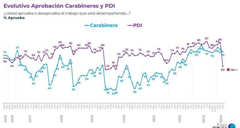 Este domingo se conocieron los resultados de la encuesta Plaza Pública, que realiza Cadem, correspondientes a la cuarta semana de marzo, los que arrojaron que, en el último mes, la aprobación a la Policía de Investigaciones (PDI) evidenció un desplome de 26 puntos, lo que representa la peor caída de la institución policial en los últimos ocho años, siendo por primera vez, desde 2016, más baja que la de Carabineros.