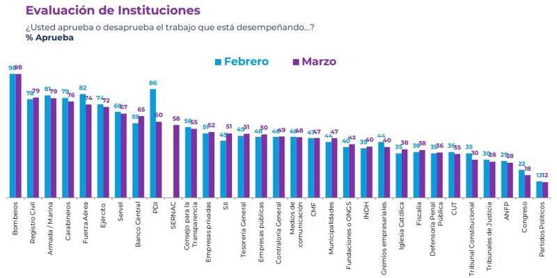 El sondeo de opinión semanal dio a conocer además que las instituciones con mayor aprobación en el último mes son Bomberos, el Registro Civil y la Armada. Por el contrario, el ranking lo cierra la Asociación Nacional de Fútbol Profesional (ANFP) con un 28% de aprobación, seguido por el Congreso (18%) y los partidos políticos (12%).