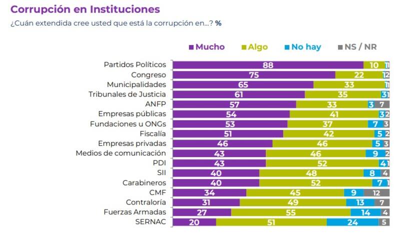 El sondeo revela además que la percepción de que en Chile hay “mucha corrupción” subió 5 puntos, llegando al 89%, siendo los partidos políticos (88%), el Congreso (75%), las municipalidades (65%) y los tribunales de justicia (61%) las instituciones con mayor corrupción.