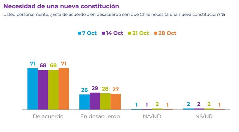 Respecto a la discusión constitucional, se evidenció una subida de 3 puntos entre quienes piensan que Chile necesita una nueva Constitución, llegando al 71%. Sin embargo, aún no existe consenso en torno al tipo de cambio que se requiere, ya que el 46% se inclina por reformar el texto actual, el 44% está por redactar una nueva Carta Magna y un 9% considera que no hay que hacer nada.