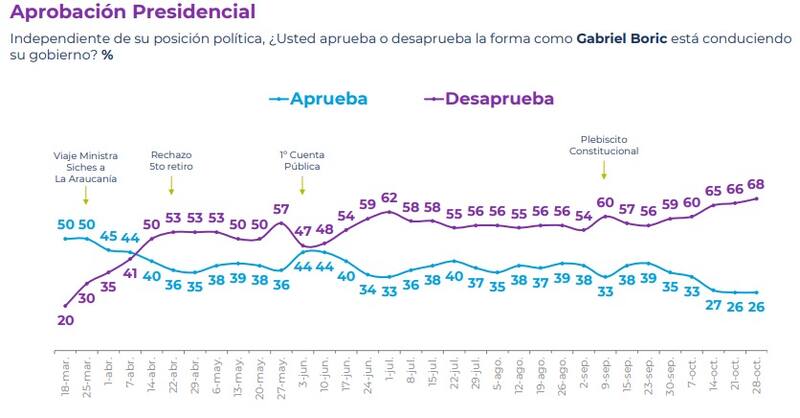 En tanto, la desaprobación a la gestión del mandatario nuevamente registró una mínima alza de dos puntos porcentuales, llegando al 68%, y acumulando un incremento de 12 puntos desde el pasado 23 de septiembre. A su vez, la aprobación del mandatario se mantuvo en 26%, cerrando octubre como su peor mes.
