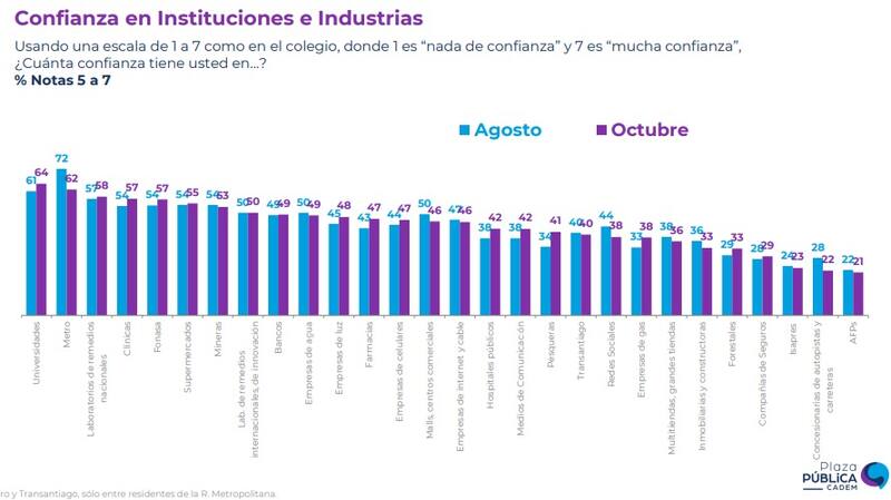 El sondeo expuso además que la empresa Metro dejó de ser la institución con mayor nivel de confianza entre los encuestados, cayendo 10 puntos respecto a la medición de agosto y llegando ahora a 62%, posicionándose en segundo lugar tras las universidades (64%) y antes de los laboratorios de remedios nacionales (58%), las clínicas (57%), Fonasa (57%) y los supermercados (55%).