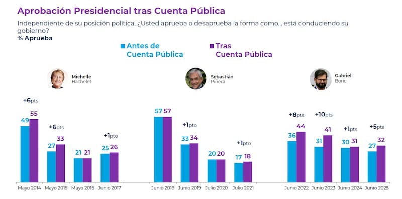 El sondeo de opinión consigna que, antes de la cuenta pública, un 27% respaldaba la gestión del Jefe de Estado, lo cual subió a 32% tras la solemne ceremonia, siendo esta mejor valorada que las últimas cuentas públicas de los segundos gobiernos de Sebastián Piñera en 2021 (18%) y Michelle Bachelet en 2017 (26%).