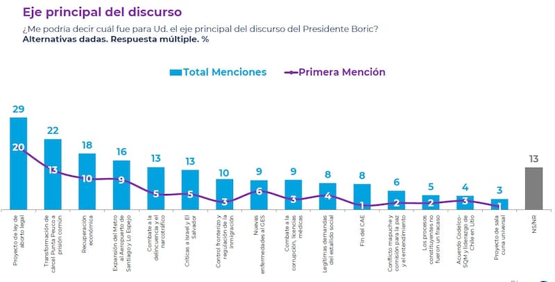 Asimismo, un 29% de la muestra señaló que el proyecto de ley de aborto legal fue el principal eje del discurso, seguido por un 22% que piensa que fue el anuncio de la transformación de la cárcel Punta Peuco a una prisión común; y un 18% que apuntó a la recuperación económica.