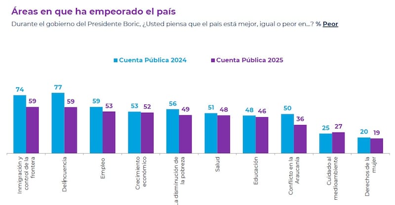 No obstante, un 59% de los consultados considera que el Mandatario omitió anuncios sobre materias importantes. Pese a ello, se evidenció una caída de 18 puntos -respecto a 2024- entre quienes creen que el país está peor en el tema de la delincuencia.