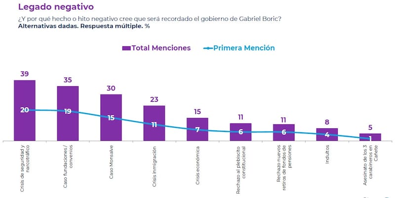 Respecto al legado negativo, un 39% cree que la actual administración será evocada por la crisis de seguridad y narcotráfico, un 35% por el caso Fundaciones-Convenios, y un 30% por el caso del exsubsecretario del Interior, Manuel Monsalve.