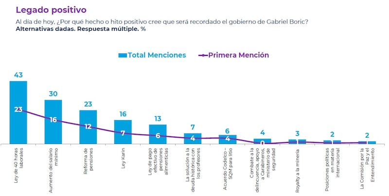 En tanto, un 43% afirma que el gobierno de Gabriel Boric será recordado por la aprobación de la ley de las 40 horas laborales, un 30% por el aumento del salario mínimo, y un 23% por la reforma de pensiones.
