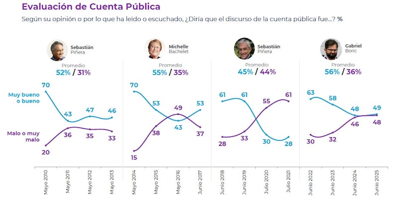 Del mismo modo, las cuatro rendiciones de Gabriel Boric, de 2022 a 2025, promedian un 56% entre quienes creen que el discurso fue bueno o muy bueno.