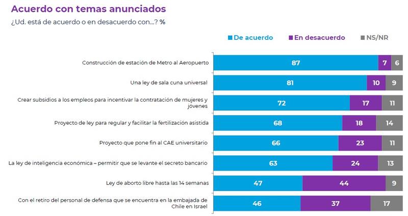En relación con los anuncios abordados en los 151 minutos que se extendió el mensaje al país, un 87% se mostró a favor de la extensión de la red de Metro al Aeropuerto Internacional de Santiago, un 81% en torno a la ley de sala cuna universal; un 72% a la creación de subsidios a los empleos para incentivar la contratación de mujeres y jóvenes, y un 68% al proyecto de ley para regular y facilitar la fertilización asistida.