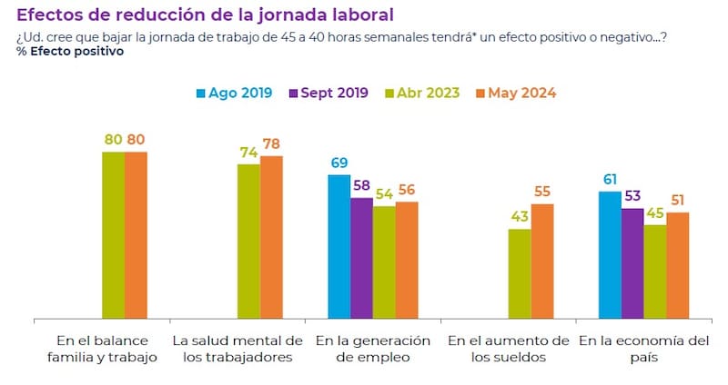 Además, un 80% está de acuerdo con que la ley de 40 horas tiene efectos positivos en el balance trabajo y familia; un 78% en la salud mental de los trabajadores y un 55% en el aumento de los sueldos.