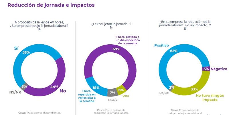 Al respecto, un 62% calificó como positiva la disminución de su jornada laboral, mientras que un 33% piensa que no tuvo ningún impacto.