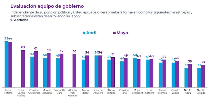 A su vez, el sondeo de opinión consignó mejoras en la aprobación de 11 integrantes del equipo de gobierno, entre ellos, la ministra de las Culturas, Carolina Arredondo (de 52% a 61%), del subsecretario del Interior Manuel Monsalve (de 50% a 58%), de la titular de Trabajo, Jeannette Jara (de 49% a 57%), del jefe del erario fiscal, Mario Marcel (de 47% a 54%), y los titulares de la Segpres y Segegob, Álvaro Elizalde (de 47% a 51%) y Camila Vallejo de (42% a 45%).