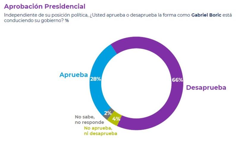 Por otra parte, en la tercera semana de mayo, la aprobación a la gestión del Presidente Gabriel Boric subió a 28% frente al 26% de la semana pasada, mientras que su desaprobación se mantuvo en un 66%.