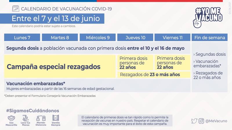 El jueves en tanto pueden vacunarse las personas de 22 años y los rezagados de 23 o más años. Como se estableció semanas atrás, durante toda la semana se podrán vacunar embarazadas. Además es la segunda dosis de los vacunados el 10 y 16 de mayo.