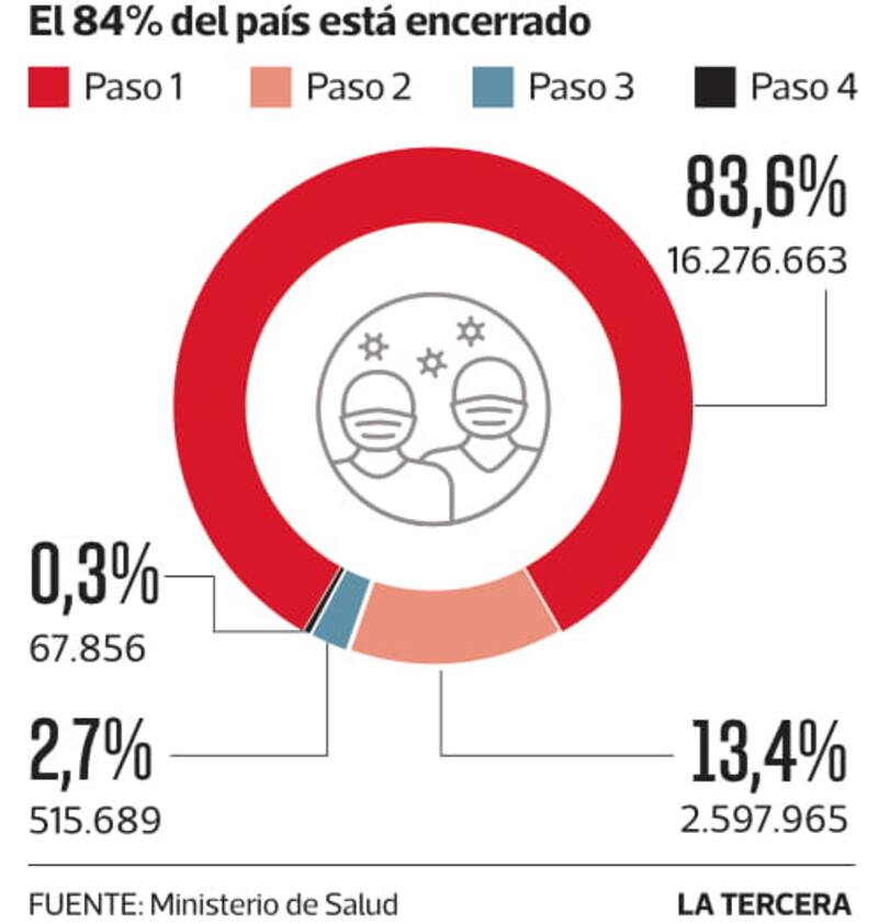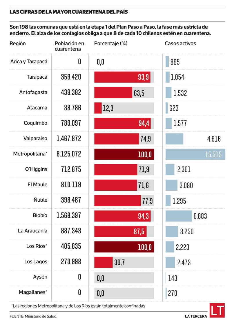 Para contener el virus, la autoridad sanitaria decretó una cuarentena que abarca a la mayor cantidad de comunas y población en lo que va de la crisis. Así, la Región Metropolitana completa amaneció confinada, luego de retroceder a la Fase 1 del Plan Paso a Paso. En el país hay 198 comunas en esta etapa, las que reúnen a 16,3 millones de habitantes, el 84% de la población (ver infografía).