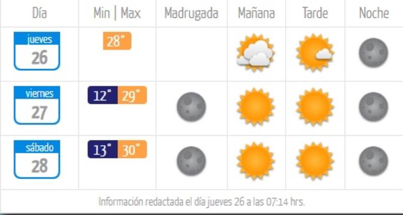 El sábado la mínima será de 13°c y la máxima de 30°c. El domingo la mínima será de 12°c y la máxima de 31°c. Para los últimos dos días del 2024 el escenario será similar, puesto que se esperan máxima de entre 30° y 32°c.