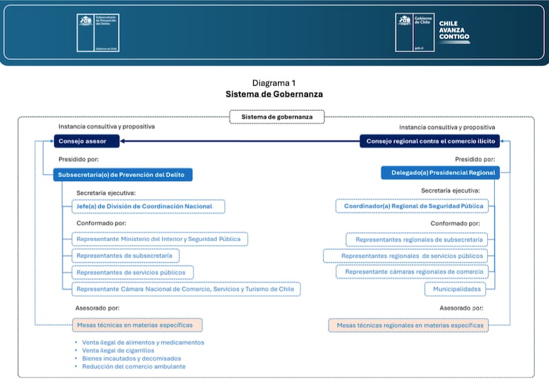 Seguido de todo el diagnóstico, el gobierno planteó la estructura y coordinación sobre la implementación de esta política. Para eso, creará tres instancias, que corresponden a un “consejo asesor”, “mesas técnicas” y “consejos regionales”. Todo, bajo lo que denominó “Sistema de Gobernanza” y que se implementará en la SPD y en las delegaciones presidenciales regionales.