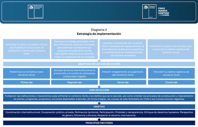 Al comienzo de la Política Nacional Contra el Comercio Ilícito, el documento plantea los cuatro ejes para hacer frente a la situación. Al final del documento, se enumeran las “líneas de acción” de esos ejes.