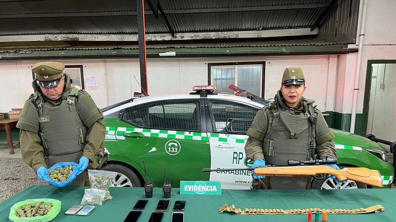 En el procedimiento se allanaron dos viviendas incautando diversas especies, entre estas, droga, un rifle de aire comprimido, munición, teléfonos celulares, radios portátiles y un cinturón táctico.