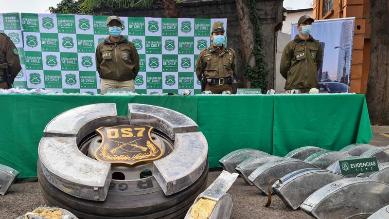Efectivos del Retén Quillagua de Iquique y Carabineros del OS7 detuvieron a dos sujetos e incautaron 50 estructuras metálicas que contenían la droga. En lugar de contar con una cámara de goma, las ruedas venían rellenas con estas estructuras con la forma interior de la llanta. Había cuatro en cada rueda para completar la circunferencia. Estas cápsulas metálicas eran introducidas en los neumáticos del vehículo.
