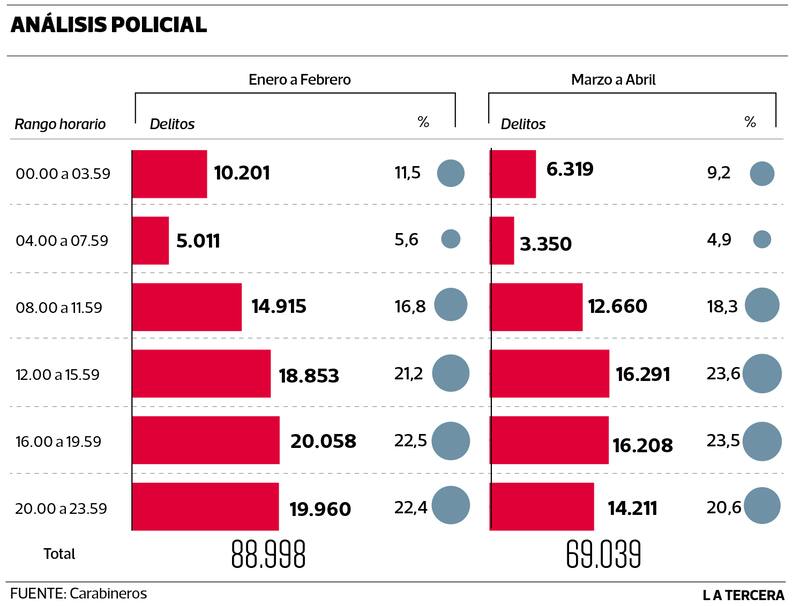 Otra variación ocurrió en el tramo de la madrugada. Carabineros da cuenta de que en enero y febrero, entre las 00.00 y las 3.59 se cometía el 11,5% de los delitos de mayor connotación social. Ahora, entre marzo y abril, el 9,2% de estos ilícitos.