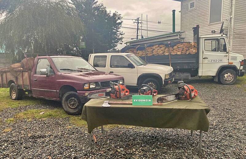 Según información de policía uniformada, se realizó la incautación de un camión y dos camionetas, todos cargados con madera de eucalipto, además de tres motosierras, bidones con combustible y hachas.