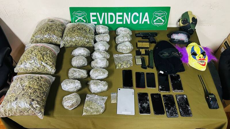 Es así como personal de Carabineros encontró un bolso el cual mantenía cuatro bolsas contenedoras de marihuana y una bolsa plástica que guardaba 15 paquetes de la misma droga. Además se encontró en un velador, varios teléfonos celulares, munición, un cargador de pistola y un arma, aparentemente de fogueo.