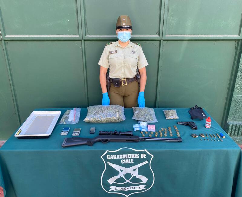 En el procedimiento incautaron elementos como una granada de mano estilo militar, munición de guerra, 1 kilo de marihuana a granel en proceso de secado, una pistola con balines de acero y una pesa para dosificar droga.