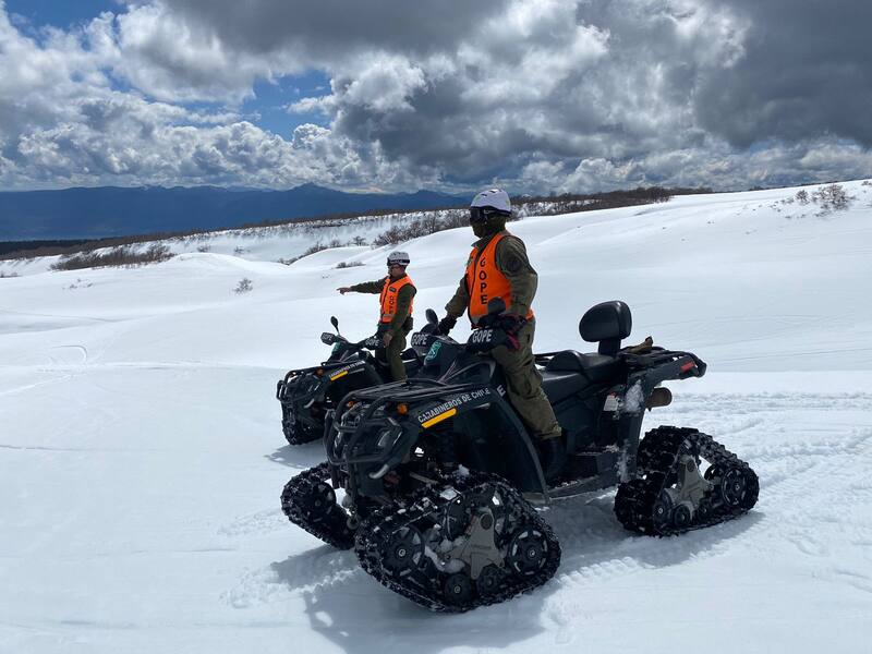 Asimismo, distintos uniformado se desplegaron en el terreno, labores que están siendo apoyadas por cuatrimotos del Grupo de Operaciones Policiales Especiales (GOPE) de Carabineros, quienes están patrullando con motos de nieve el perímetro del macizo. También, conversaron con familias que habiten en las cercanías del volcán para entregarles las recomendaciones correspondientes.