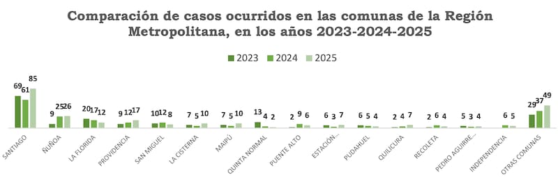“Le siguen a la comuna de Santiago, las comunas de Ñuñoa, La Florida, Providencia y San Miguel, de las cuales Ñuñoa y Providencia superan los casos del años 2023 y 2024, y La Florida y San Miguel presentan menos casos que los años anteriores. Estas cinco comunas agrupan el 57,8% de los casos ocurridos en el año 2025 en la Región Metropolitana”, dice el informe.