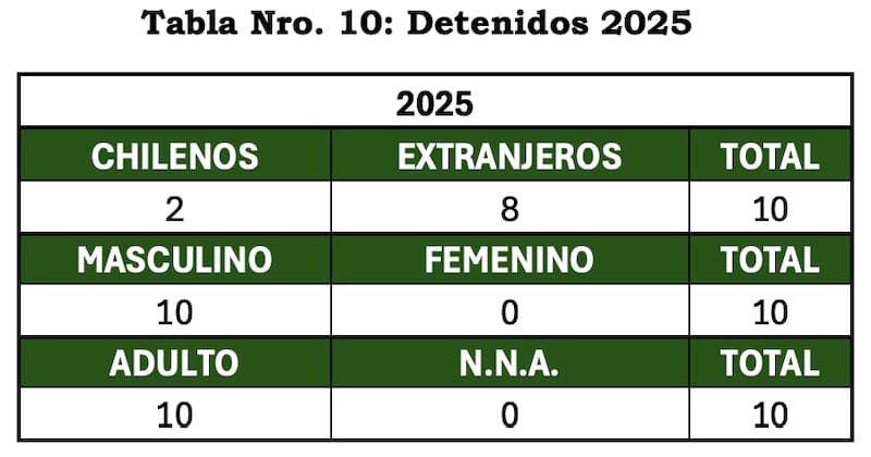 En los tres años analizados, la mayoría de estos delincuentes ha sido extranjeros y siempre hombres. En 2023 hubo 7 chilenos y 18 extranjeros detenidos: en 2024, 6 extranjeros y ningún chileno detenido, y en 2025 van 2 chilenos y 8 extranjeros aprehendidos. “La principal nacionalidad extranjera involucrada es la venezolana”, afirma el texto.