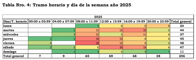 Para 2024, se identificó que la mayoría de estos hechos ocurren entre miércoles y sábado, entre el mediodía y las 20.00. Y fue el sábado, entre 12.00 a 15.59, cuando más se denunciaron.