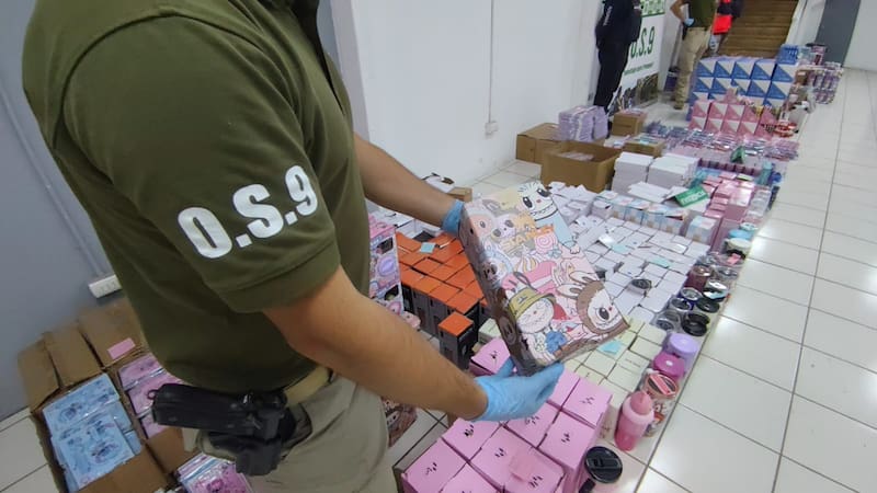 Entre los cientos de productos incautados hay, entre otros, juguetes, muñecos, relojes, audífonos, mini consolas y útiles escolares imitando reconocidas marcas como Labubu, Stitch, Hello Kitt, Kuromi, My Melody, Cinnamoroll, Mario Bross y Marvel.