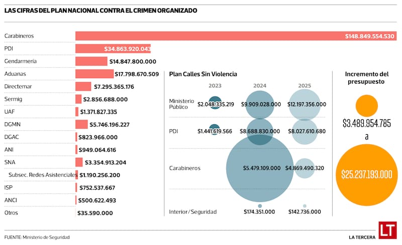 De acuerdo a cifras del gobierno, entre los años 2022 y 2024 se invirtieron más de $ 161 mil millones en el Plan Contra el Crimen Organizado (PNCO). Con todo, considerando el presupuesto aprobado para 2025, y tras la rebaja presupuestaria, en 4 años se habrá invertido más de $ 241 mil millones en ese programa.