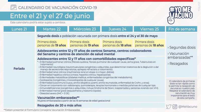 Por otra parte, esta semana -a partir del martes 22, considerando que el lunes es feriado- se dará inicio al proceso de inmunización en jóvenes de 18 y 19 años. En el caso de las personas de 19, podrán acudir a los vacunatorios el martes y miércoles, mientras que quienes tienen 18 años lo podrán hacer el jueves y viernes.